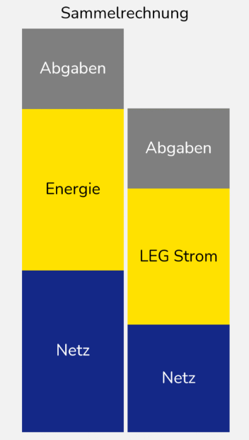 Der hier definierte Vergütungssatz bezieht sich nur auf die innerhalb der LEG gehandelten Strom (Energietarif). Auf der Abrechnung werden wie bisher der Netznutzungstarif mit entsprechendem Abschlag (20 oder 40%) sowie die Kosten von Systemdienstleistungen, die Kosten für die Stromreserve, der Netzzuschlag und Abgaben und Leistungen an das Gemeindewesen. Zusätzlicher Strombedarf, welcher nicht von LEG-internem Strom gedeckt werden kann, wird wie bisher aus der Grundversorgung oder vom zuständigen Energielieferanten bezogen und verrechnet.